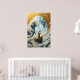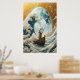 Ein alter Mann in einem kleinen Boot fischen in einer riesigen Welle mit einem großen Mond im Hintergrund. Er ist in weißen Roben gekleidet und hält eine Angelrute. Die Welle stürzt um ihn herum, aber er scheint unbeeindruckt zu sein.