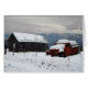 Eine winterliche, ländliche Szene mit einem schneebedeckten, verfallenen, alten, roten LKW, der in der Nähe einer Ramschkabine nahe Sandpoint, ID sitzt.