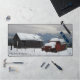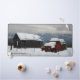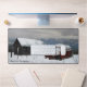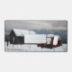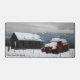 Eine winterliche Landschaft mit einem schneebedeckten, verfallenen, alten, roten LKW, der in der Nähe einer Kampferhütte nah zu Sandpoint, ID sitzt. Fügen Sie Ihren eigenen Text hinzu.