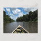 Ein Boot nast einen Fluss im Amazonasdschungel unter puffigen Wolken in einem blauen Himmel hinunter.