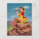 Klassische PinUp-Karte mit einem PinUp Girl, das auf einem Felsen sitzt und die Natur mit Ferngläsern erforscht, gemalt von Art Frahm (1907-1981)