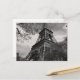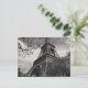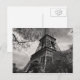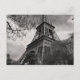 Ein weiterer Blick auf den Eiffelturm, wunderschön gerahmt in dieser schwarz-weißen Postkarte. Silhouette gegen einen digital verbesserten bewölkten Himmel und umgeben von Bäumen.