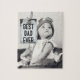 Fügen Sie Ihr eigenes Foto hinzu, um das perfekte Geschenk des Vaters für den Vater zu erstellen. Dieses Puzzle enthält eine Schwarz-Weiß-Taggrafik, die BEST VATER JE in fett gedruckten, schwarzen Buchstaben ausliest.