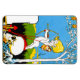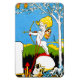 Kleine blonde cupid-ähnliche Karikaturenfigur mit Flügeln und großen roten Schuhen, die sich den Bogen knacken, während sie auf einem Schädel stehend sind. Illustration des italienischen Karikaturisten Antonio Rubino aus dem Cover von Maggiolata, 1906.