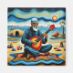 A.I. hat einen bärtigen Mann mit einem Hut auf einer farbenprächtigen Matte gedruckt und dabei ein Bouzouki-Streichinstrument an einem surrealen Strand mit lebhaften, wirbelnden Mustern gespielt. Die Landschaft zeichnet sich durch ungewöhnliche Felsformationen, eine helle Sonne und ein ruhiges Meer aus.