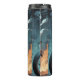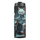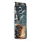 Eine Katze, ganz weiß gekleidet wie ein Geist, der ein Motorrad durch eine unheimlich Spuk Stadt mit Skelettköpfen und unheilvollen Wolken fährt.