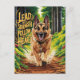 Ein deutscher Schäferhund läuft durch einen üppigen Waldweg und taucht beim Sprint Schmutz und Blätter auf. Der Hund hat eine Leine am Halsband, und seine Zunge vergnügt sich. Der Hintergrund ist ein lebendiger, grüner Wald und ein Zitat über das Führen mit Kraft und das Befolgen mit Herz