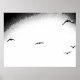 Diese Vögel (Möwen) fliegen in den endlosen Himmel. Ihre schwarzen Silhouetten vor dem weißen Hintergrund, der schwarz kommt, machen dieses Foto wirklich einzigartig.