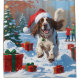 Ein anmutiger englischer Setter läuft fröhlich durch die schneebedeckte Winterszene und trägt einen festlichen roten Weihnachtshut. Dieses elegante Design hebt das gepolsterte Mantel der Rasse, die sanfte Persönlichkeit und den lebendigen Geist hervor und erweckt gleichzeitig die Wärme und den Zauber der Urlaubssaison. Ein herzlicher Winterurlaub voller festlichen Charme.
