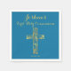 Moderne erste heilige Kommunion Servietten für Jungen mit einem goldenen Kreuz auf blauem Hintergrund. Personalisieren Sie Ihre Daten mit Namen, Text und Datum.