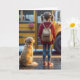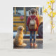 Ein junges Mädchen mit Schwänzen und einem Polka-gepunkteten Rucksack wartet an einem regnerischen Tag vor einem Schulbus, begleitet von einem goldenen Retriever. Inside message kann geändert werden.