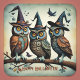 Beängstigend, aber niedlich. Ein Trio von Eulen mit Hexenhüten; surrealer Stil, künstlich Intelligenz generierte Kunstwerke, auf Aufklebern zum Halloween-Vergnügen. Also saisonbedingt! So stilvoll! Benutzen Sie diese zum Siegel von Umschlägen und Paketen, oder dekorieren Sie Ihre Scrapbooks.