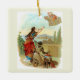 Vintage-Malillustration für ein Märchen von Hans Christian Andersen, bei der die Tochter des Sultans in Vintage-Türkischer Kleidung, mit langen braunen Haaren und Armbändern neben ihrer Dienerin steht, die ein Essen zubereitet, befinden sich oben auf einem Turm, wo die Dame einem Mann am Himmel zuwinkt, der sich in einem fliegenden Koffer befindet, ihr zuwinkt und in einem orangefarbenen Kleid gekleidet ist.