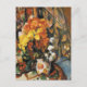 Eine Kunstpostkarte mit dem postimpressionistischen Gemälde des französischen Künstlers Paul Cézanne (1839-1906), Die Flower Vase (Le Vase Fleuri) (C. 1896). Herbstfarbene Chrysanthemen vor einem Hintergrund der Draperie.