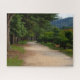 Ein friedlicher Spazierweg in einem traditionellen koreanischen Garten wurde festgehalten. Das warme Sonnenlicht, das durch üppige Bäume fällt, und die Textur des Erdbodens bringen eine Atmosphäre der Entspannung und Ruhe in jeden täglichen Raum.