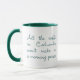 "All the coffee in Columbia wird mich nicht zu einem Morgenmensch machen" Geschrieben in einer grünen Hand Schreibstil Schriftart auf beiden Seiten der Tasse.