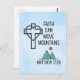 Eine Postkarte mit einem inspirierenden Christlichen Zitat, das lautet: Der Glaube kann die Berge bewegen. Matthew 17:20. Mit einem Bild von Bergen und einem Kreuz mit einem Herz.