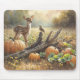 Eine in der Nähe eines Kürbispflasters stehende Fabe, die einen kleinen Vogel auf einem Baumstamm beobachtet