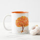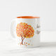 Die Tasse des Kaffees ist mit einem hübschen Kunstdruck von Herbstbäumen ausgestellt. Der Herbst ist schön, um diesen Gegenstand oder kaufen, wie es ist. Bild