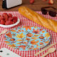 Schönes Herbstthema für Ihren Erntedank Tisch! Goldene und rustikale Blätter, rosa und rote Blume, rote Beeren und braune Nüsse verbinden sich auf himmelblauem Hintergrund.