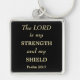 Diese schöne Schlüsselkette hat den Text in Goldschrift "The LORD is my Strength and my Shield" aus Psalm 28:7. Diese inspirierend Wörter werden auf einem dramatischen schwarzen Hintergrund platziert