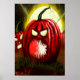 Ein roter, wütender Kürbis mit einem hinter ihm stehenden Kürbis, mit einem großen Mond im Hintergrund, dunkler und düster farbiger Kunst.