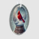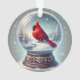 Ein lebendiger, roter Kardinal inmitten einer verzierten Schneekugel, umgeben von einer frostigen Winterlandschaft mit Schneebäumen und zarten Schneeflocken.