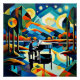 A.I. erstellt Print of vibranwing szene zeigt eine Person, die ein Klavier gegen einen zauberhaften, sternhaften Nachthimmel über einem bunten Kubist spielt, surreal Landschaft umfasst sanfte Hügel, Bäume und einen See, der die leuchtenden Himmelskörper reflektiert