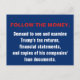 Text: Folgen Sie dem Geld. Verlangen Sie, Trumps Steuererklärungen, Finanzberichte und Kopien der Kreditdokumente seiner Unternehmen einzusehen und zu prüfen. Patriotisches Thema mit rot-weißem Text auf blauem Hintergrund. #IdesOfTrump #TheIdesofTrump #TrumpTaxesMarch #TrumpSteuern Der Widerstand geht weiter auf den Ides of Trump, während des Trump-März und jeden Tag.