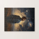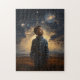 Treten Sie ein in ein Reich, in dem Sterne sprechen und der Himmel Türen für andere Welten öffnet. Hier ist ein junger Abenteurer, gebadet in goldenem Sternenlicht, stehend hoch unter einem wirbelnden galaktischen Himmel. Da sich die Planeten über- und Herbstfelder erstrecken, verbindet dieses Rätsel Wunder, Mut und den Ruf des Unbekannten.