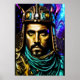 Ein Portrait eines Kriegers mit Schnurrbart und Bart mit Helm und Rüstung in viel goldener Farbe. Das ist eine künstlerische KI.