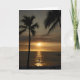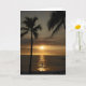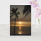 Eine hübsche Blankokarte mit einem tropischen Sonnenuntergangsfoto am Strand und der Sonnenstrahl, der über den Ozean strömt, beleuchtet einen Surfer, der eine letzte Welle fängt. Foto von Rebecca Reeder.