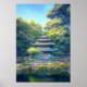 Dieses atemberaubende Stück digitaler Kunst zeigt perfekt den Geist eines großen japanischen Tempels. Die lebhaften Gelb- und Rosatönen, die den Teich umschließen, sorgen für ein angenehmes Ambiente, und der ruhige, grüne Wald im Hintergrund verleiht dem Ganzen ein Gefühl von Ruhe und Harmonie. Dieses Gemälde ist ein bemerkenswertes Meisterwerk, da es die zarten architektonischen Elemente des Tempels in brillanten Farbtönen wunderschön einfängt.