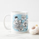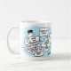 Tasse der Werbeagentur. Ein Marketing-Manager hält an einem Werbestandort fest, der aus einer Reihe ermüdeter Ideen und Klischees besteht. Eine lustige Werbekampagne bei einer Werbeagentur. Spaß der Werbeagentur.