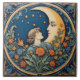 Ein junger Mann im Alter von 20 Jahren mit lockig braunem Haar und Blick auf einen Halbmond mit rückwärts startendem Gesicht, umgeben von Blume und Sternen, dunkelblauem Hintergrund.