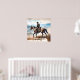 Dieses moderne Design hat einen Cowboy auf einem Pferd mit Bergen in der Ferne.