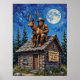 Dieses skurrile Bild zeigt Bigfoot, ein großes, haariges Wesen, das einen Cowboyhut und eine Weste trägt und auf dem Dach einer rustikalen Blockhütte unter einem hellen Vollmond sitzt. Er hält sanft einen jungen Elch auf dem Schoß. Die Hütte ist von grünen Bäumen umgeben, der Nachthimmel ist tiefblau mit wirbelnden Wolken und Sternen. Ein hölzernes Schild an der Kabine lautet: "Bigfoot glaubt auch nicht an euch". Das Kunstwerk wird mit dicken, strukturierten Pinselstrichen gerendert, was ihm eine traumhafte und leicht surreale Qualität verleiht.