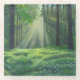 Das Sonnenlicht filtert durch große, dichte Bäume und strahlt ein strahlendes Licht über einen üppigen, grünen Waldboden mit zarten, weißen Blume. Die ruhige Umgebung verleiht dem Ganzen ein Gefühl von Ruhe und Entspannung.