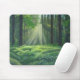 Das Sonnenlicht filtert durch große, dichte Bäume und strahlt ein strahlendes Licht über einen üppigen, grünen Waldboden mit zarten, weißen Blume. Die ruhige Umgebung verleiht dem Ganzen ein Gefühl von Ruhe und Entspannung.