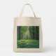 Das Sonnenlicht filtert durch große, dichte Bäume und strahlt ein strahlendes Licht über einen üppigen, grünen Waldboden mit zarten, weißen Blume. Die ruhige Umgebung verleiht dem Ganzen ein Gefühl von Ruhe und Entspannung.