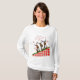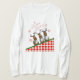 Ein Trio Rentiere jubelt, dass "Der Weihnachtsmann kommt!" Der Text und die Schneeflocken sind rot umrissen, damit das Design auf der Kleidungsfarbe Ihrer Wahl funktioniert.