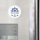 Stilvoller runder Kühlschrank-Magnet mit Ihrem personalisierten Strandhaus, Seehaus, Familiennamen oder anderen Texten mit eigenem nautischen Schiffrad - Helm, Anker, Kreuzohren und Sternen in Marineblau auf Weiß oder wählen Sie Hintergrundfarben, um Ihre Einrichtung zu ergänzen. Macht ein großartiges, einzigartiges Geschenk.