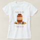 Der T - Shirt der Frauen mit einem illustrierten Entwurf eines lächelnden Erdnussbutterglases, das zwischen zwei Stapel der Erdnüsse stehend ist. Die Wörter "Erdnussbutter? Erdnuss besser!" stellen Sie über und unter dem Cartooncharakter dar. Alle Wörter können besonders angefertigt werden.