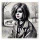 Ein melancholisches Mädchen, das mit einer Lederjacke und einem Nirvana-T-Shirt gekleidet ist, sitzt in einem Wüstenpark. Sein dunkles Make-up und seine Haare sind stumpf, und sein Rebellion wird immer lauter. Das Ganze ist im Vintage-Stil gezeichnet.