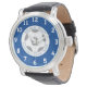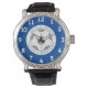 Eine Armbanduhr für den glühenden Fußballfans. Zeigen Sie Ihren eigenen Namen und den Namen des Fußballclubs, den Sie unterstützen. Fußball-Motiv für jeden Fußballfan, der ein Team unterstützt, das blau spielt.