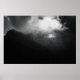 Landschaftsfoto eines majestätischen gemeinsamen Raven (Corvus Corax), der über den Bergen fliegt, bedeckt mit atemberaubenden weißen Wolken. In schwarz und weiß verarbeitet.