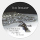 Diese runden Aufkleber haben ein Schwarz-Weiß-Foto (ich nahm) des Rosenkranzes mit einem verschwommenen Kreuzkruzifix Jesus auf dem Kreuz und ein wunderschönes Zitat von St. Louis de Montfort (1673-1716), einem französisch-römisch-katholischen Priester: Das Rosary ist ein unschätzbar inspirierter Schatz.