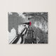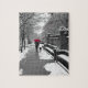 Unter der Überdachung eines roten Regenschirmes, geht eine Frau ihr Hund an einem winterlichen Tag.