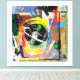 Eine gemischte Collage verfügt über eine Vinyl Platte in ihrer Mitte, umgeben von farbenfrohen abstrakten Mustern und verschiedenen Texturen. Fette Farbspritzen und mehrschichtige Elemente schaffen eine dynamische und lebendige Komposition.
