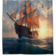 Ein majestätisches Segelschiff navigiert durch die Ozeanwellen unter einem dramatischen Himmel, während Möwen in der Nähe fliegen. Der warme Schein der untergehenden Sonne wirft lebendige Farben auf die Segel des Schiffes und die umliegenden Wolken.